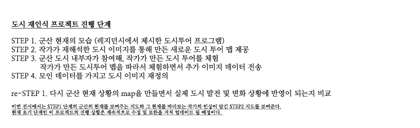 이 외부자들이 제공한 이미지에 내부자들이 생각한 이미지나 미래지향적 이미지들을 추가하여 모아진 데이터들을 바탕으로 다시 새로운 도시 모습을 구성하고 발전시키는 과정을 통해 지속적으로 도시를 반성적으로 돌아보게 하는 작업입니다. 일련의 도시 재인식 과정을 통해 자기가 살고 있는 장소의 정체성을 인정하도록 하고, 도시의 발전적인 변화에 참여하게끔 유도하며, 이를 다시 작업에 반영하는 열린