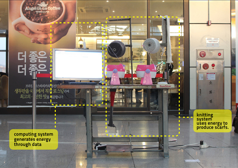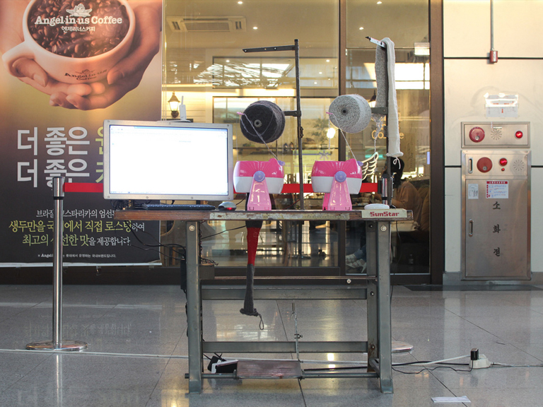 “How can we place value on our daily network activity?” We go on Facebook, Twitter, email, google search and upload/download digital files in a network environment every single day. We produce and consume data. Depending on our network activity, some data would be given more value than others while some would be underestimated or disappear without notice. Some information would stand out, while some would rarely be used. ![]() Data Currency is a visualization system that reveals our network actions in terms of network labor. In other words, going on Facebook, tweeting, and searching on Google could be considered “labor” in a network environment. This hybrid table, “Data Currency,” converts search activities into physical energy. ![]() This idea came about from comparing the similarities between sewing factories and computer labs. Factory workers work for a production line, and computer users use their physical energy towards data. ![]() This physical installation combines a computer with a knitting system. Users search and produce data on the installed computer on the left, which generates the power to run the knitting machines on the right. The amount of power it generates is based on the value of the information produced. [video] exhibition : Gwang Ju Biennale (2011), Art Center Nabi (2012), Juan Media Art (2012), Sungnam Art Center (2013) |