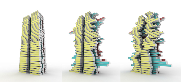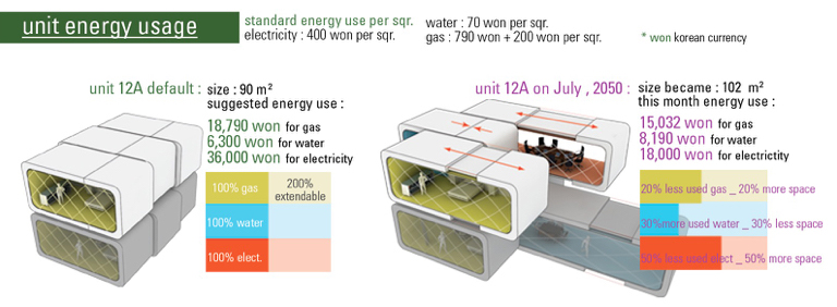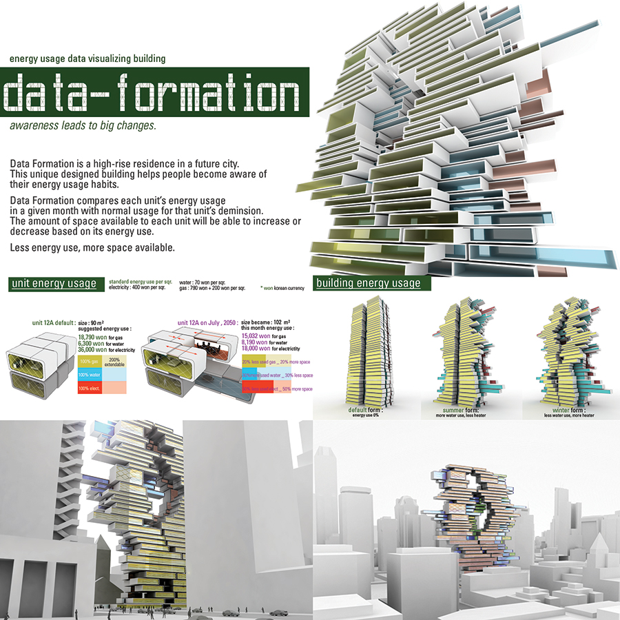 The use of visuals can be a very strong form of communication. Having said that, what if we applied data to a physical space? If data is used to determine physical space, would that be an effective way to make people more aware of their habits? ![]() "Data formation" is a future high-rise residence building that changes its physical form based on the home’s energy usage. The size of the residence is in accordance with the amount of energy used. If the residents were to waste more energy than normal, the apartment would decrease in size. If they were to conserve energy, the size would increase. This is a conceptual building that might lead to behavioral changes through virtual changes in the size and shape of the apartments. If we are affected by the data we generate, we might have a stronger motivation to change our behavior in positive ways. ![]() This picture shows how each unit changes. The picture on the left shows what it would look like if no energy has been used. It is 90 square meters. After a month, if the residents use gas, water, or electricity, the size would increase to 102 square meters. This energy usage data goes directly to the place of where it was produced. ![]() The entire building could be reshaped like this. The left side is more of a straightforward shape, which means no energy has been used. As people start to use it, the shape could change in this way. It would be different every month and every season. Therefore, the residents and the public could easily notice their energy usage by the size of the unit, and by the shape of the building. We are dealing with energy used on a daily basis, so it is a very direct way to apply the data back to the original source from which it was produced. collaboration with : AnL studio award : iida (Incheon International Design Award), 2009 |