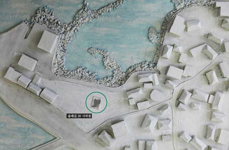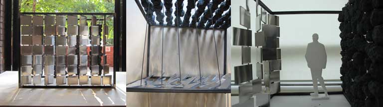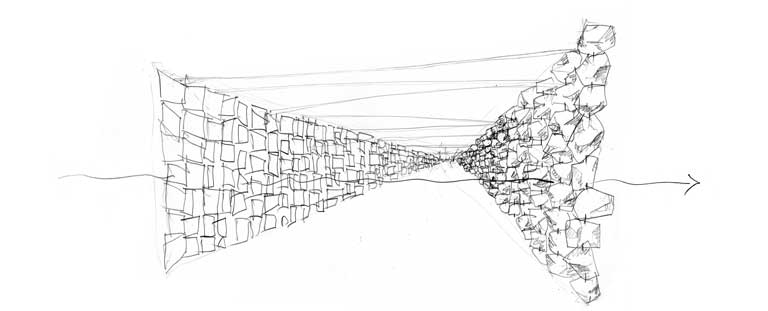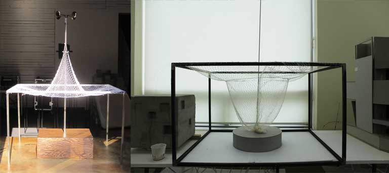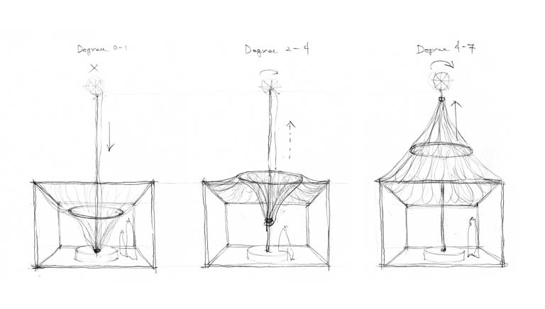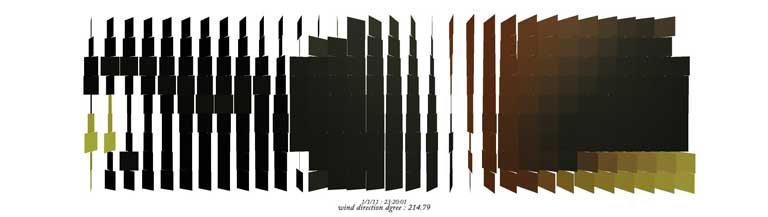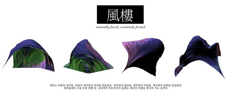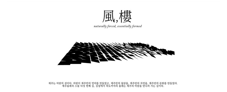 Wind force not only generates electricity, it also changes and reforms our views of space and the environment. Jeju Island, Korea is famous for its windy weather. There are a number of wind mills that generate power and distributes it to the people. As you can see, the wind is a useful natural resource. The Poungru project not only sees the wind as a source of energy, but it also explores how the wind influences our views and the environment. This project was done in collaboration with Nameless Architect and Energy Research Center in 2013. [Process] Project condition : choose one of the given sites, use wind force data, and develop a permanent pavilion. First we spot the location of where people hike casually. We then come up with two ideas: - view point - resting space ![]() the site view ![]() the site location concept _01. Wind, Scenery ![]() This installation has two walls; the front having panels and the back filled with rocks. Panels at the front rotate according to the wind. This movement of panels generates power to rotate the poles on the back wall, which have rocks on them. As a result, it frames the sea, sky, and road all in one, and is continuously changed by the wind. ![]() - "Wind, Scenery" sketch. Panels are on the left, stones are on the right. ![]() - simulation with real wind data ![]() - simulation with real wind data ![]() - prototype concept _02. Wind, space ![]() Strong winds destroy everything and light breezes help spread seeds. We call it nature law. This second idea is about creating a space that is transformed by the force of the wind. With heavy winds, the installed mechanic system on top of the pavillion drops down and closes the space. With a light breeze, the pulley goes up and opens up the space. The process is similar to the pulling and posting of flags. ![]() - "Wind, Space" sketch. The pulley goes up and down. ![]() - simulation with real wind data ![]() - simulation with real wind data ![]() - prototype [Concept video] [Final installation] After many discussions and meetings, we decided to develop the first idea, Wind and Scenery. Because the site is outdoors without power, maintenance is the primary issue. - final installation with nameless Architect, randomwalks, Energy Research Center for Nature and Media Annuale , 2013 (https://www.facebook.com/NatureMediaAnnuale) sponsored by Jeju KimNyeong Village, Energy Technology Research Center @ jeju |