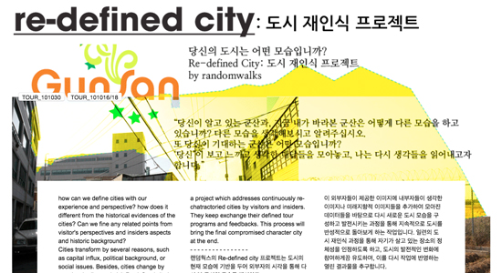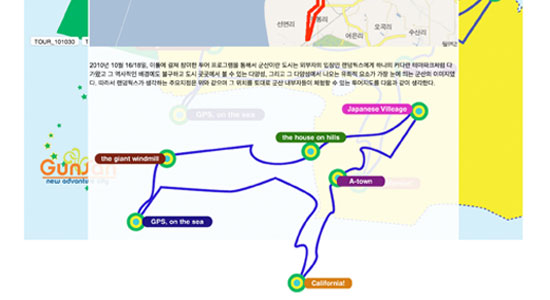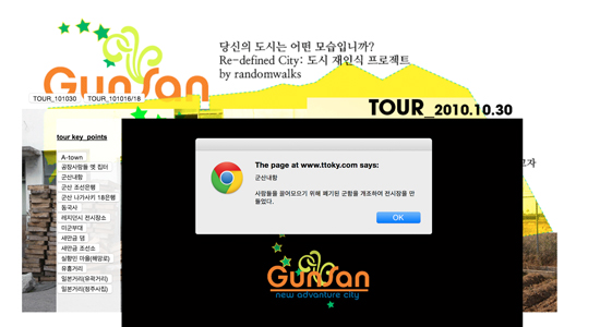 [STEPs] STEP_01 : Present Gunsan. Visitors (artists) follows the tour map designed by locals. STEP_02 : Visitors (artists) redesign the map upon their experience and feedback. STEP_03 : Locals follows the map redesigned by visitors. STEP_04 : Locals redesign the tour map upon their experience. STEP_05 : Steps 1-4 are repeated until both locals and visitors are satisfied. project site : http://www.ttoky.com/gunsan/index.html |